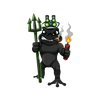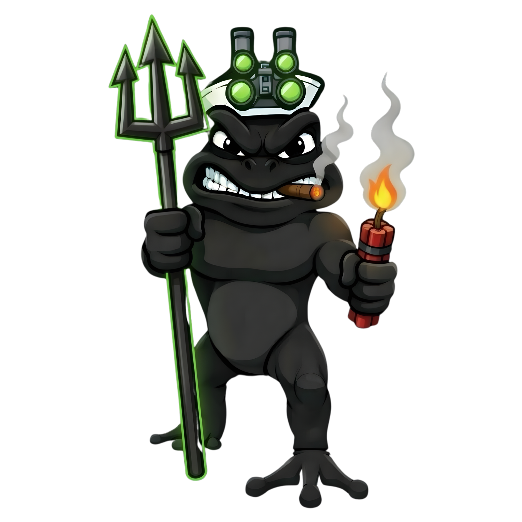 Hellfrog arises from the depths of hell. His trident hammered in the void's merciless black forge. He ignites and draws deep on his cigar, and rasps, "who shall be next?"